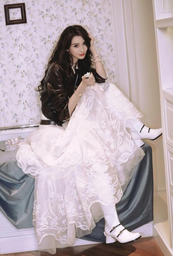 上身穿一件深褐色的短款皮衣,里面搭条白色蕾丝长裙,腰间还系了一条腰带,让腰线更明显。