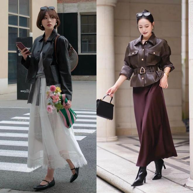皮衣很利落、很酷,与长裙的甜美形成了强烈的对比,再搭配一双白色的玛丽珍靴,整体风格更加突出。