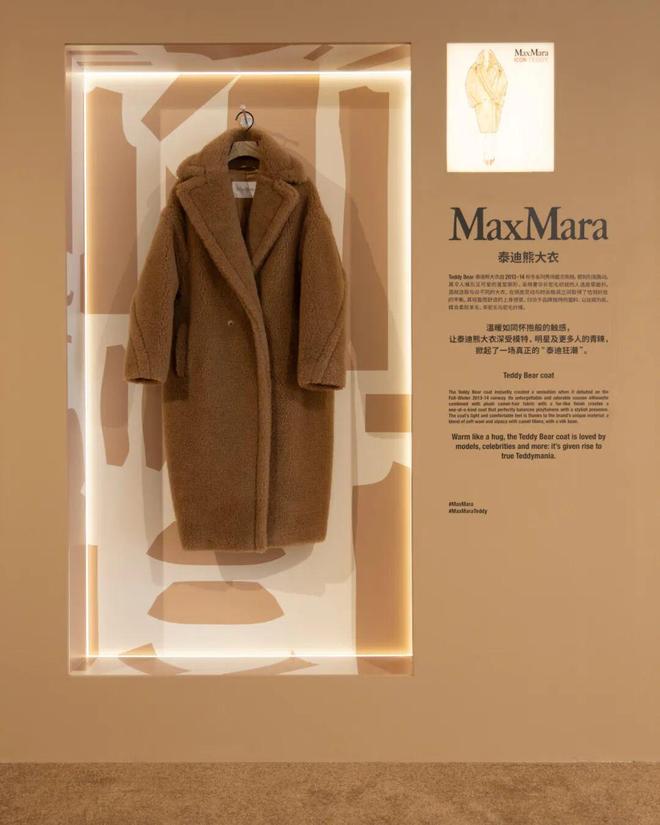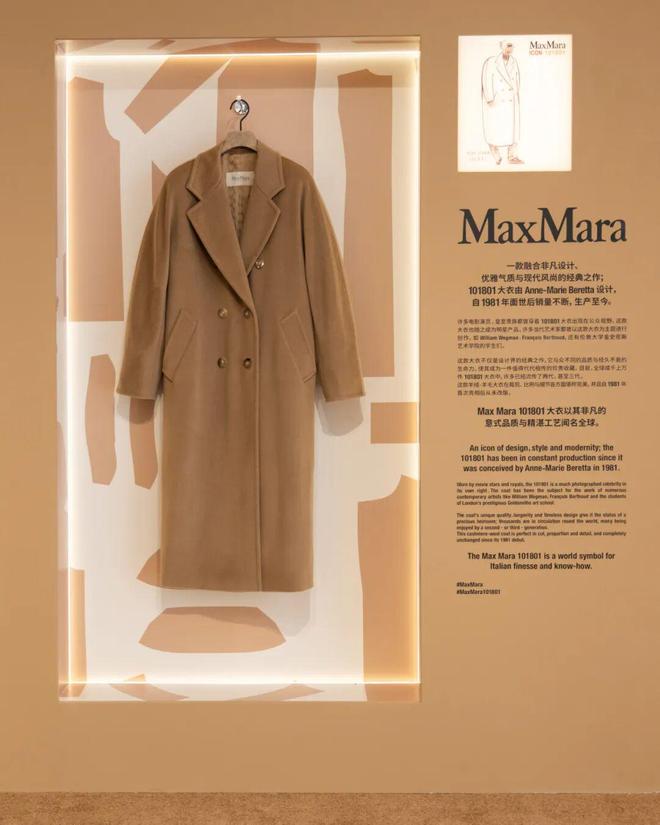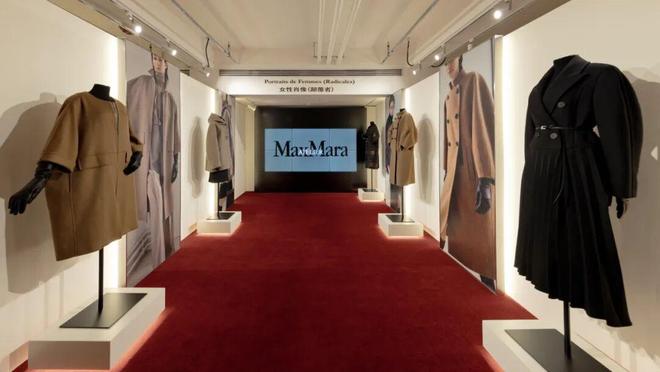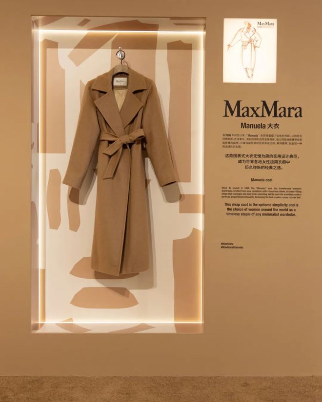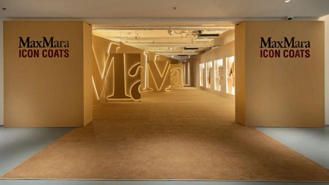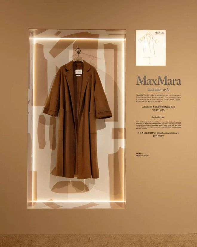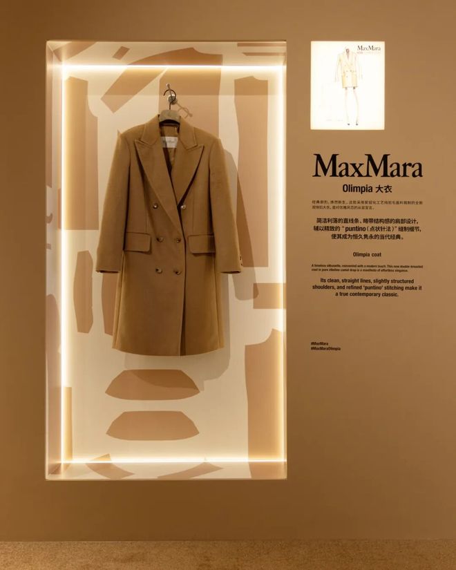 首先映入眼帘的便是Max Mara 极具代表性的驼色空间,这里宛如一座被精心构筑的大衣档案馆,展示了五款Max Mara引以为傲的ICON 大衣,每一件作品都仿佛在讲述一段关于工艺、创新与时代精神的故事篇章。品牌在此区域特别设置试衣空间,邀请嘉宾亲身感受这些经典之作的独特魅力与卓越剪裁。
