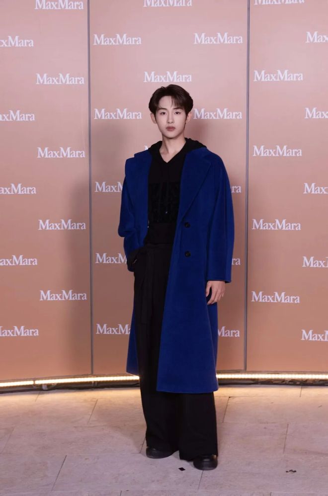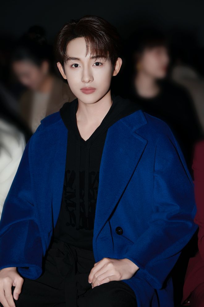 董思成以一袭釉蓝色101801大衣搭配黑色卫衣造型亮相,尽显摩登绅士风范。