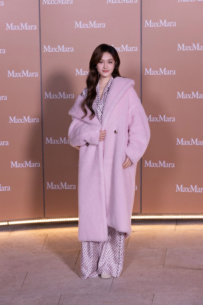 李兰迪身着2026早春系列粉色泰迪熊大衣,简约流畅的剪裁从容表达她清新优雅的气质。