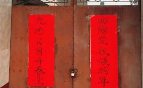 对联的书写和张贴:上下联竖行书写,从上到下。张贴时,面对大门,上联在右,下联在左。